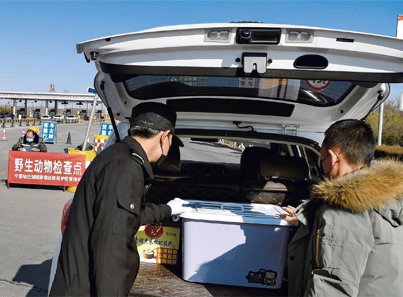 2020年2月2日,在宁夏盐池县青银高速公路花马池出入口野生动物检查点,工作人员检查即将驶出的车辆。 新华社记者 冯开华/摄