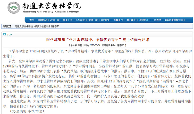 学部分团委举办“信仰公开课-战‘疫’云演讲”和“学习雷锋精神,争做优秀青年”公开课,坚持将思想引领与疫情防控相结合,通过同学们将疫情防控中的所见所闻、所思所想,转变成观点鲜明、内涵深刻的演讲。